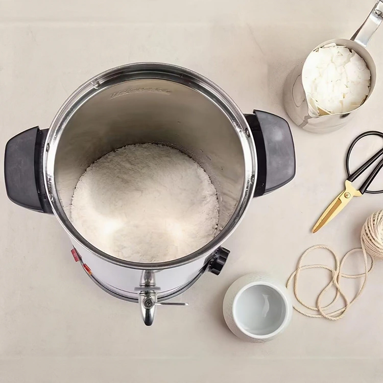 Προσφέρουμε ένα πλήρες φάσμα προδιαγραφών χωρητικότητας, συμπεριλαμβανομένων των 5L, 8L, 10L, 12L, 15L, 25L, 35L, 45L και άλλων επιλογών, που καλύπτουν ανάγκες τήξης κεριού μικρής, μεσαίας και μεγάλης κλίμακας. Τα μοντέλα μικρής χωρητικότητας (5L-15L) είναι κατάλληλα για μικρές παρτίδες DIY στούντιο και μικρής κλίμακας κηροποιίες, καταλαμβάνουν λιγότερο χώρο και είναι εύκολο να μετακινηθούν. τα μοντέλα μεγάλης χωρητικότητας (25L-45L) είναι σχεδιασμένα για παραγωγή βιομηχανικής κλίμακας, ικανά να λιώνουν μεγάλη ποσότητα κεριού ταυτόχρονα, βελτιώνοντας την απόδοση παραγωγής.